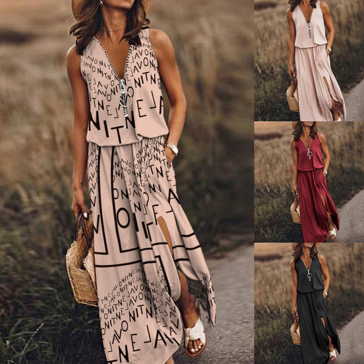 📢Гореща разпродажба🔥💟👗【S-5XL】Нова лятна модна рокля без ръкави с цип и щампа на талията