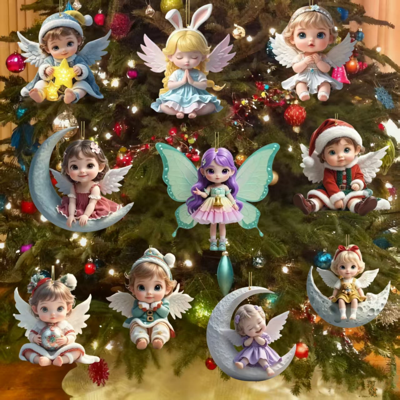 🎁【Sváteční speciál - sleva 50 %】【Balení 10 kusů】Roztomilé doplňky do auta s andělem, plochý akrylový přívěsek, lze použít jako tašku na notebook, klíčenku, vánoční dekoraci.