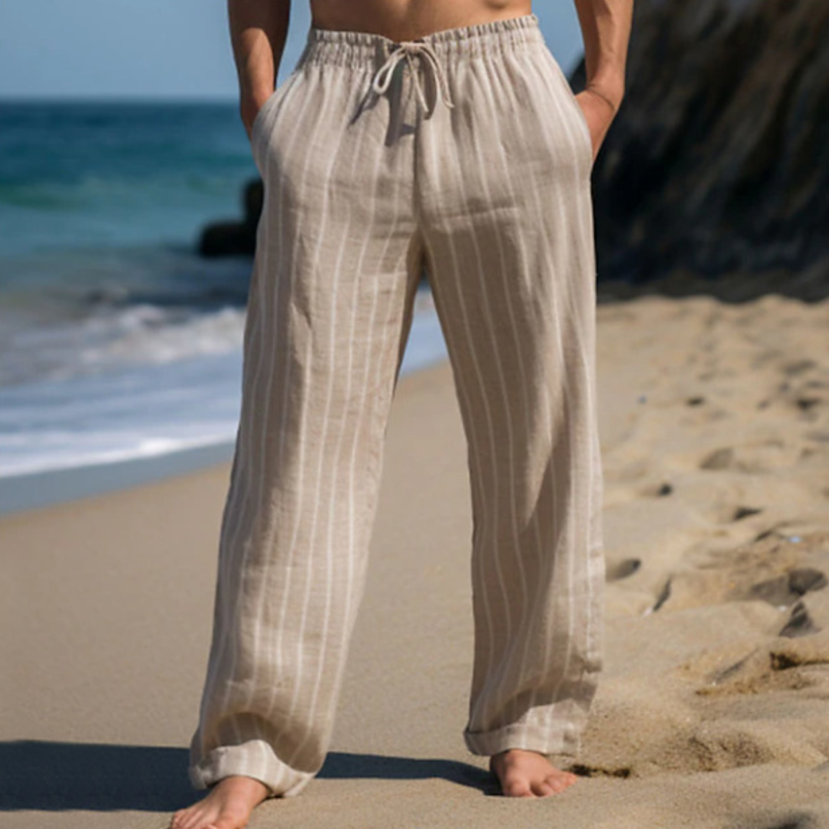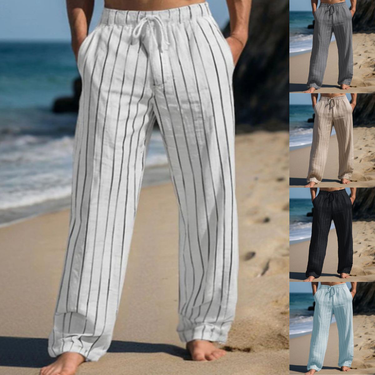 🎹👖【50% popust 🔥】【M–3XL】😍 Moške nove lanene hlače večjih velikosti s črtami, ravnega kroja, z elastičnim pasom in vrvico