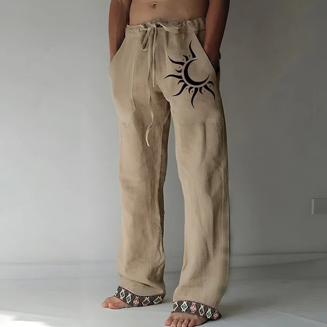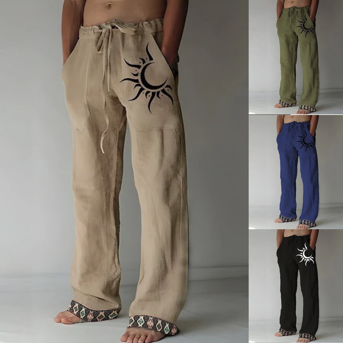 👖🌙【50% popust 🔥】【S–6XL】Nove moške hlače iz bombaža in lana z luninim vzorcem, široke ravne hlačnice, ležerni kroj, večje velikosti