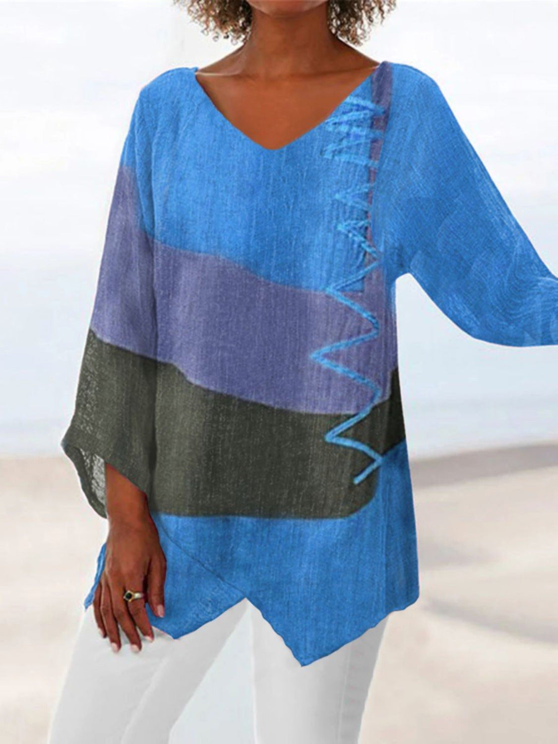 ššćS-4XLćNov priložnostni umetniÅ”ki tisk z nepravilnim robom in V-izrezom z dolgimi rokavi