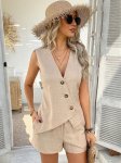 ššć2-delni kompletććS-XLćEnobarvni prazniÄni jopica z gumbi, brezrokavnik in kratke hlaÄe