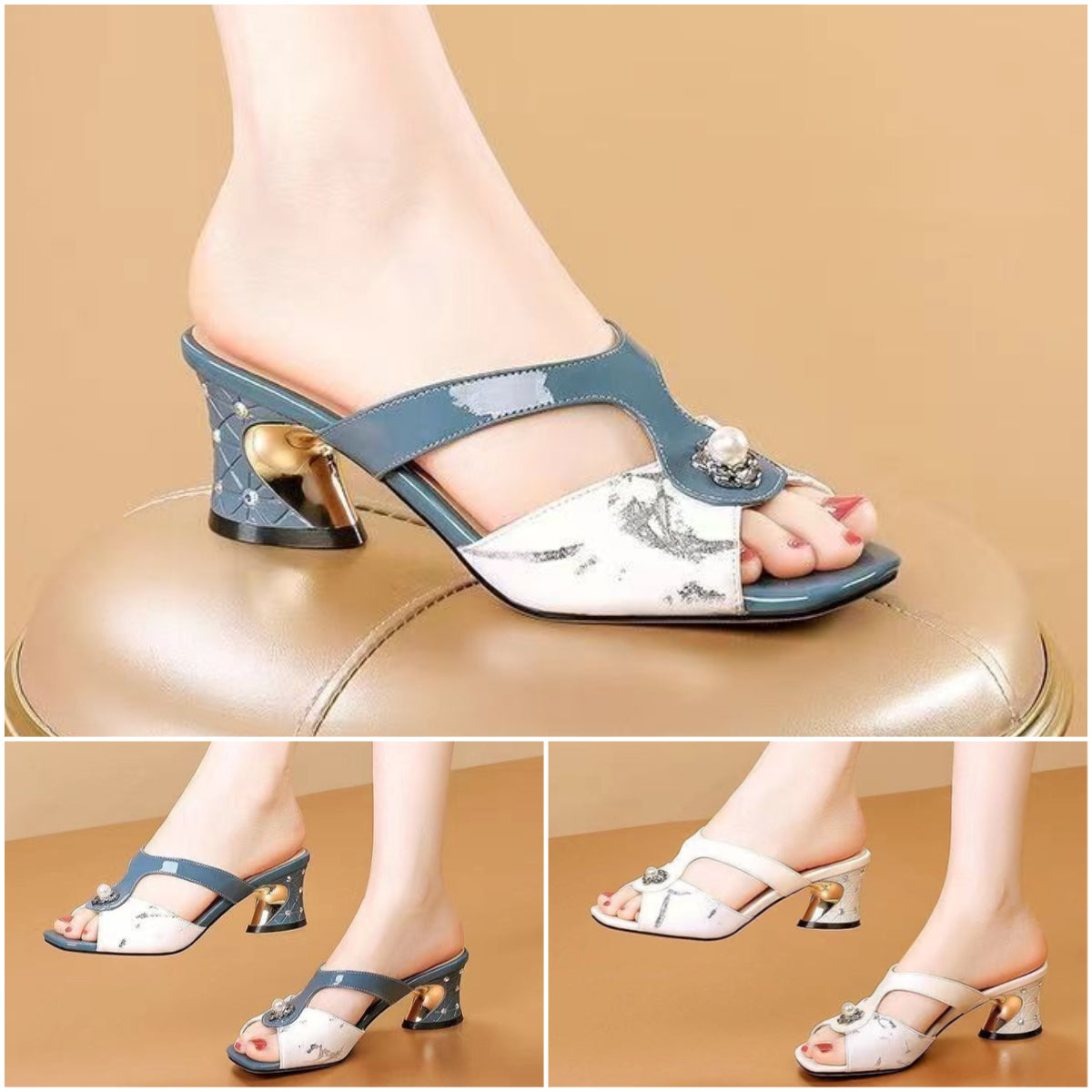 👡💍【50% popust ✨】【35–40】Novi modni zračni copati z odprtimi prsti in debelo peto, okrašeni z biseri, za vsakodnevno nošenje
