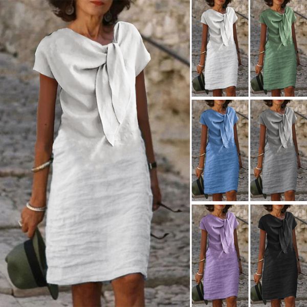 【S-3XL】Obleka iz bombaža in lana z okroglim izrezom in zavezovanjem, enobarvna, s kratkimi rokavi, model 2025