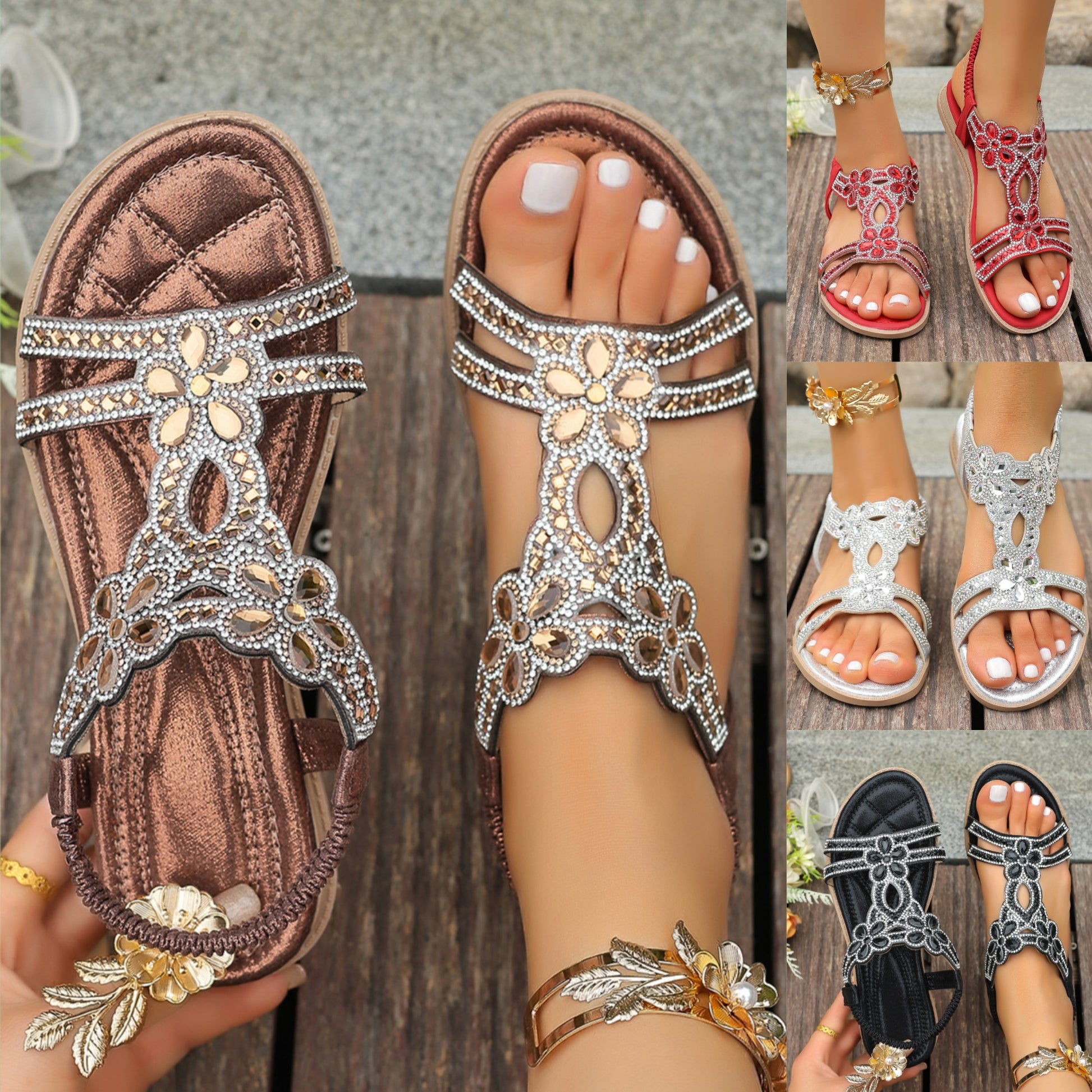 👡❤️【36-43】【Reducere de 50%】Sandale elastice cu flori și strasuri boeme 2025, talpă plată, mărime mare