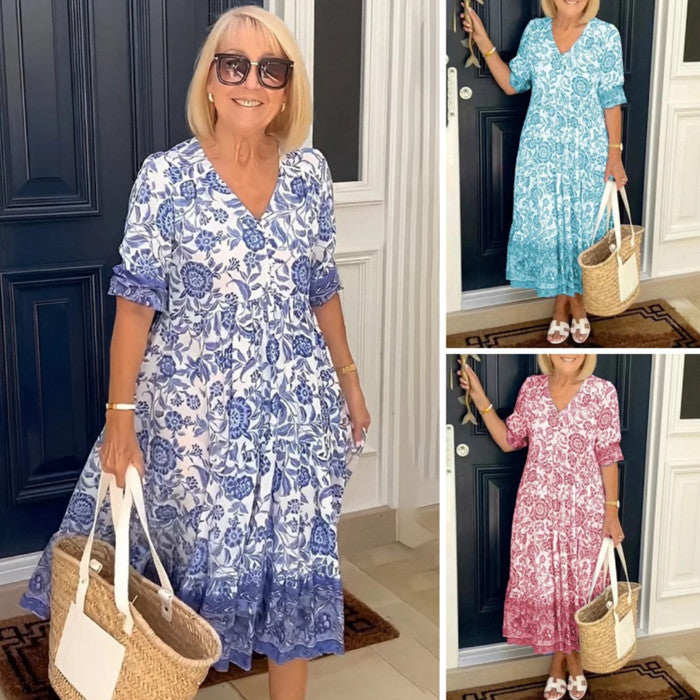 💃【S-3XL】Rochie lungă elegantă cu imprimeu floral și decolteu în V, nouă 2025_3994382