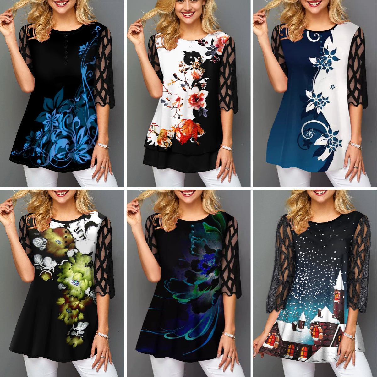 【S-5XL】Tricou 2025 cu guler rotund, imprimeu cu nasturi și cusături din dantelă, mânecă jumătate